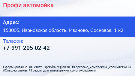 Профи, автомойка по адресу 153005, Ивановская область, Иваново, Сосновая, 1 к2 в дальнейшем Организация, размещена в следующих категориях: