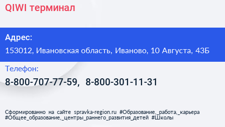 QIWI, терминал по адресу 153012, Ивановская область, Иваново, 10 Августа, 43Б в дальнейшем Организация, размещена в следующих категориях: