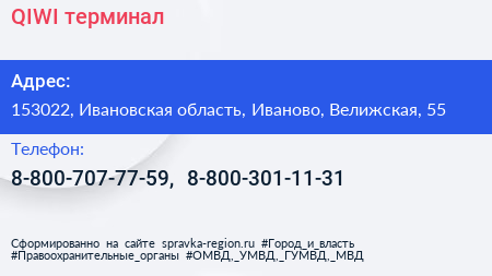 QIWI, терминал по адресу 153022, Ивановская область, Иваново, Велижская, 55 в дальнейшем Организация, размещена в следующих категориях: