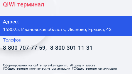 QIWI, терминал по адресу 153025, Ивановская область, Иваново, Ермака, 43 в дальнейшем Организация, размещена в следующих категориях:
