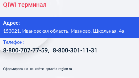 QIWI, терминал по адресу 153021, Ивановская область, Иваново, Школьная, 4а в дальнейшем Организация, размещена в следующих категориях: