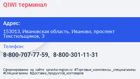 QIWI, терминал по адресу 153013, Ивановская область, Иваново, проспект Текстильщиков, 3 в дальнейшем Организация, размещена в следующих категориях: