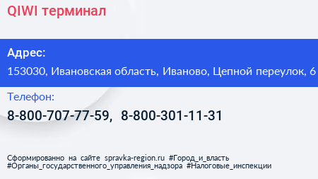 QIWI, терминал по адресу 153030, Ивановская область, Иваново, Цепной переулок, 6 в дальнейшем Организация, размещена в следующих категориях: