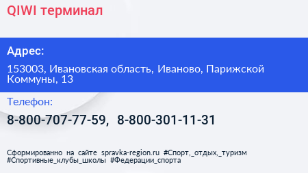 QIWI, терминал по адресу 153003, Ивановская область, Иваново, Парижской Коммуны, 13 в дальнейшем Организация, размещена в следующих категориях: