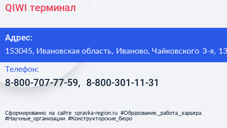 QIWI, терминал по адресу 153045, Ивановская область, Иваново, Чайковского 3-я, 13 в дальнейшем Организация, размещена в следующих категориях: