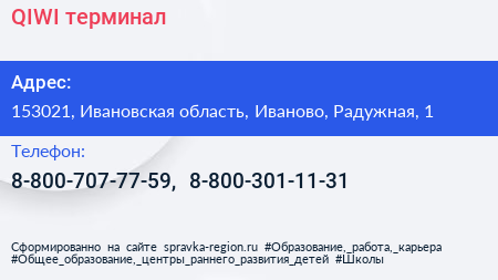 QIWI, терминал по адресу 153021, Ивановская область, Иваново, Радужная, 1 в дальнейшем Организация, размещена в следующих категориях: