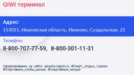 QIWI, терминал по адресу 153011, Ивановская область, Иваново, Суздальская, 21 в дальнейшем Организация, размещена в следующих категориях: