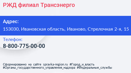 РЖД, филиал Трансэнерго по адресу 153030, Ивановская область, Иваново, Стрелочная 2-я, 15 в дальнейшем Организация, размещена в следующих категориях: