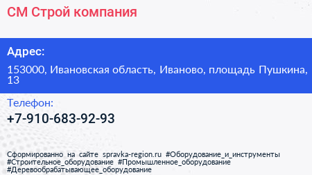 СМ-Строй, компания по адресу 153000, Ивановская область, Иваново, площадь Пушкина, 13 в дальнейшем Организация, размещена в следующих категориях: