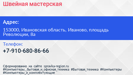 Швейная мастерская по адресу 153000, Ивановская область, Иваново, площадь Революции, 8а в дальнейшем Организация, размещена в следующих категориях: