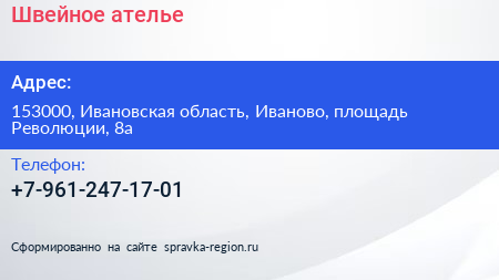 Швейное ателье по адресу 153000, Ивановская область, Иваново, площадь Революции, 8а в дальнейшем Организация, размещена в следующих категориях: