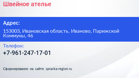 Швейное ателье по адресу 153003, Ивановская область, Иваново, Парижской Коммуны, 46 в дальнейшем Организация, размещена в следующих категориях: