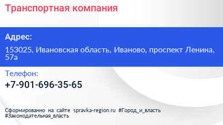Транспортная компания по адресу 153025, Ивановская область, Иваново, проспект Ленина, 57а в дальнейшем Организация, размещена в следующих категориях: