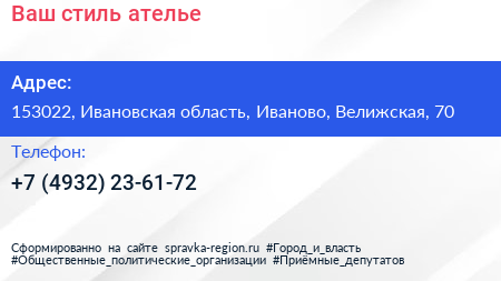 Ваш стиль, ателье по адресу 153022, Ивановская область, Иваново, Велижская, 70 в дальнейшем Организация, размещена в следующих категориях: