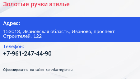 Золотые ручки, ателье по адресу 153013, Ивановская область, Иваново, проспект Строителей, 122 в дальнейшем Организация, размещена в следующих категориях: