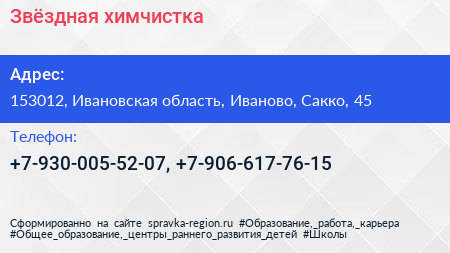 Звёздная, химчистка по адресу 153012, Ивановская область, Иваново, Сакко, 45 в дальнейшем Организация, размещена в следующих категориях: