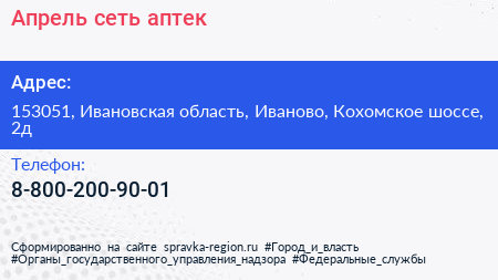 Апрель, сеть аптек по адресу 153051, Ивановская область, Иваново, Кохомское шоссе, 2д в дальнейшем Организация, размещена в следующих категориях: