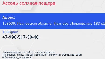 Ассоль, соляная пещера по адресу 153009, Ивановская область, Иваново, Лежневская, 183 к1 в дальнейшем Организация, размещена в следующих категориях: