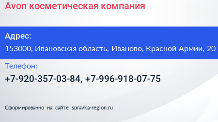 Avon, косметическая компания по адресу 153000, Ивановская область, Иваново, Красной Армии, 20 в дальнейшем Организация, размещена в следующих категориях: