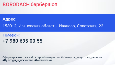 BORODACH, барбершоп по адресу 153012, Ивановская область, Иваново, Советская, 22 в дальнейшем Организация, размещена в следующих категориях: