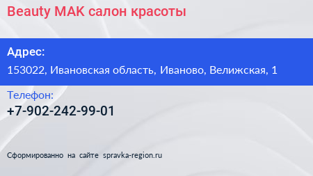 Beauty MAK, салон красоты по адресу 153022, Ивановская область, Иваново, Велижская, 1 в дальнейшем Организация, размещена в следующих категориях: