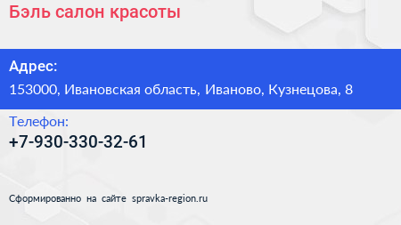 Бэль, салон красоты по адресу 153000, Ивановская область, Иваново, Кузнецова, 8 в дальнейшем Организация, размещена в следующих категориях: