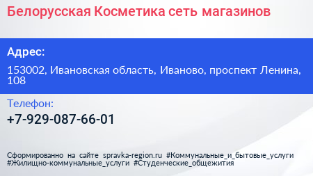 Белорусская Косметика, сеть магазинов по адресу 153002, Ивановская область, Иваново, проспект Ленина, 108 в дальнейшем Организация, размещена в следующих категориях: