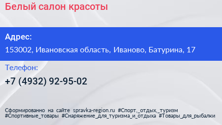 Белый, салон красоты по адресу 153002, Ивановская область, Иваново, Батурина, 17 в дальнейшем Организация, размещена в следующих категориях: