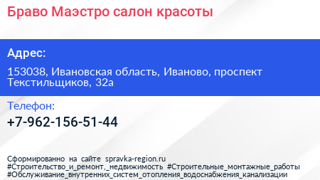 Браво Маэстро, салон красоты по адресу 153038, Ивановская область, Иваново, проспект Текстильщиков, 32а в дальнейшем Организация, размещена в следующих категориях: