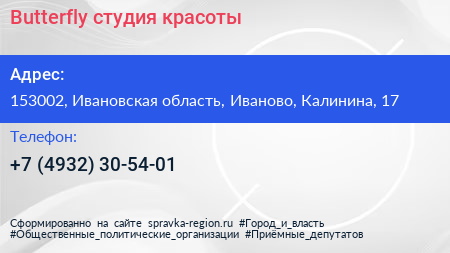 Butterfly, студия красоты по адресу 153002, Ивановская область, Иваново, Калинина, 17 в дальнейшем Организация, размещена в следующих категориях: