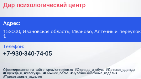 Дар, психологический центр по адресу 153000, Ивановская область, Иваново, Аптечный переулок, 1 в дальнейшем Организация, размещена в следующих категориях: