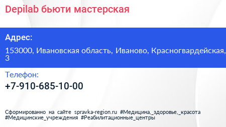 Depilab, бьюти-мастерская по адресу 153000, Ивановская область, Иваново, Красногвардейская, 3 в дальнейшем Организация, размещена в следующих категориях: