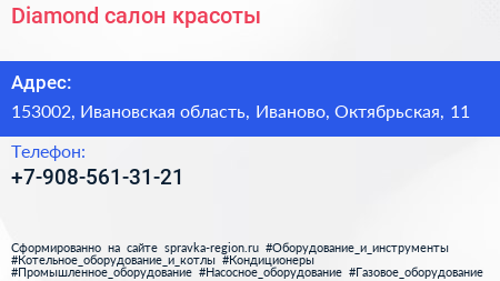 Diamond, салон красоты по адресу 153002, Ивановская область, Иваново, Октябрьская, 11 в дальнейшем Организация, размещена в следующих категориях: