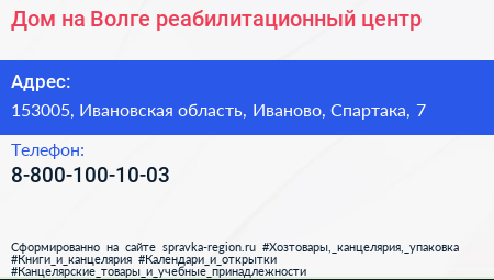 Дом на Волге, реабилитационный центр по адресу 153005, Ивановская область, Иваново, Спартака, 7 в дальнейшем Организация, размещена в следующих категориях: