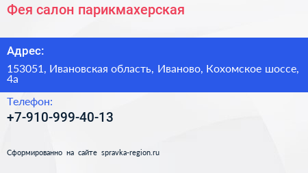Фея, салон-парикмахерская по адресу 153051, Ивановская область, Иваново, Кохомское шоссе, 4а в дальнейшем Организация, размещена в следующих категориях:
