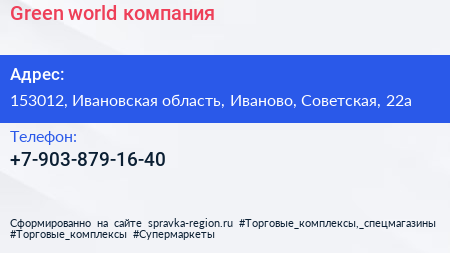 Green world, компания по адресу 153012, Ивановская область, Иваново, Советская, 22а в дальнейшем Организация, размещена в следующих категориях: