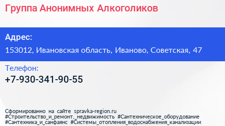 Группа Анонимных Алкоголиков по адресу 153012, Ивановская область, Иваново, Советская, 47 в дальнейшем Организация, размещена в следующих категориях: