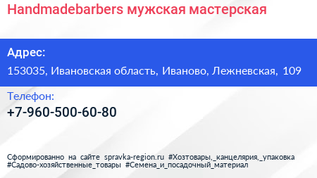 Handmadebarbers, мужская мастерская по адресу 153035, Ивановская область, Иваново, Лежневская, 109 в дальнейшем Организация, размещена в следующих категориях: