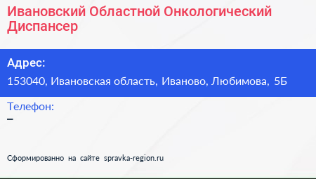 Ивановский Областной Онкологический Диспансер по адресу 153040, Ивановская область, Иваново, Любимова, 5Б в дальнейшем Организация, размещена в следующих категориях: