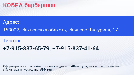 КОБРА, барбершоп по адресу 153002, Ивановская область, Иваново, Батурина, 17 в дальнейшем Организация, размещена в следующих категориях: