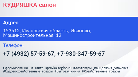 КУДРЯШКА, салон по адресу 153512, Ивановская область, Иваново, Машиностроительная, 12 в дальнейшем Организация, размещена в следующих категориях: