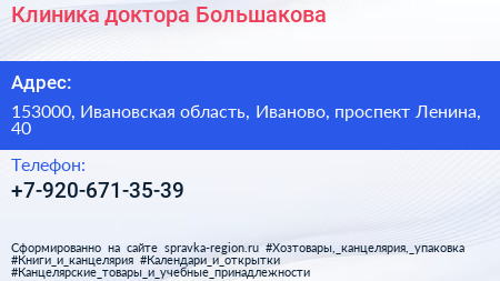Клиника доктора Большакова по адресу 153000, Ивановская область, Иваново, проспект Ленина, 40 в дальнейшем Организация, размещена в следующих категориях: