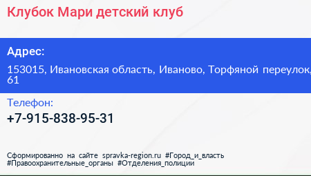 Клубок Мари, детский клуб по адресу 153015, Ивановская область, Иваново, Торфяной переулок, 61 в дальнейшем Организация, размещена в следующих категориях: