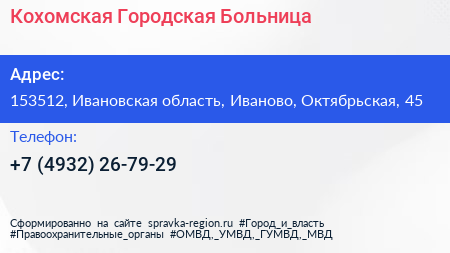 Кохомская Городская Больница по адресу 153512, Ивановская область, Иваново, Октябрьская, 45 в дальнейшем Организация, размещена в следующих категориях: