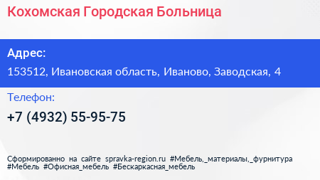 Кохомская Городская Больница по адресу 153512, Ивановская область, Иваново, Заводская, 4 в дальнейшем Организация, размещена в следующих категориях: