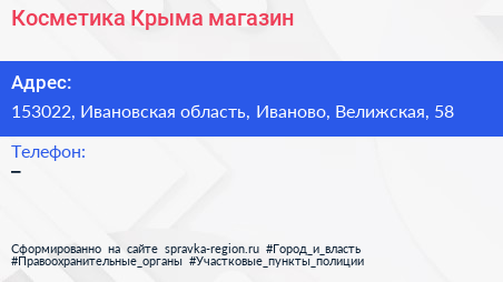 Косметика Крыма, магазин по адресу 153022, Ивановская область, Иваново, Велижская, 58 в дальнейшем Организация, размещена в следующих категориях:
