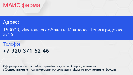 МАИС, фирма по адресу 153003, Ивановская область, Иваново, Ленинградская, 3/16 в дальнейшем Организация, размещена в следующих категориях: