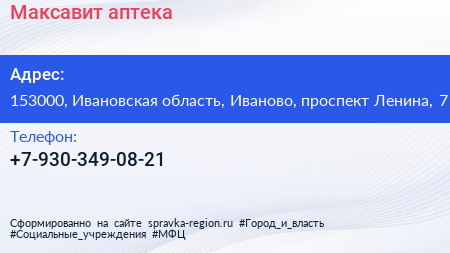 Максавит, аптека по адресу 153000, Ивановская область, Иваново, проспект Ленина, 7 в дальнейшем Организация, размещена в следующих категориях: