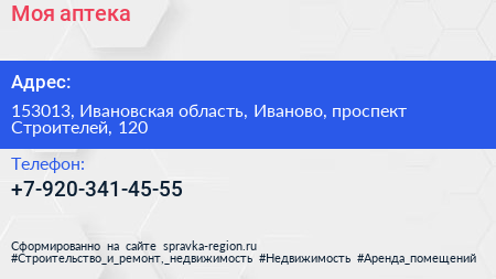 Моя аптека по адресу 153013, Ивановская область, Иваново, проспект Строителей, 120 в дальнейшем Организация, размещена в следующих категориях: