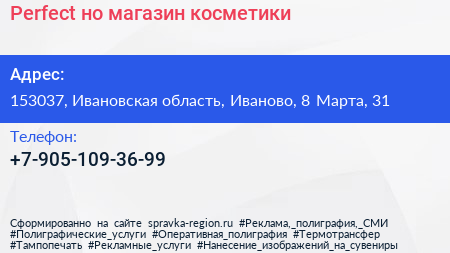 Perfect`но, магазин косметики по адресу 153037, Ивановская область, Иваново, 8 Марта, 31 в дальнейшем Организация, размещена в следующих категориях: